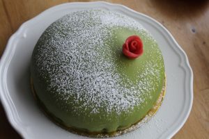 Ingredients: whipping cream, marzipan, raspberries, eggs, sugar, flour, baking powder, icing sugar.