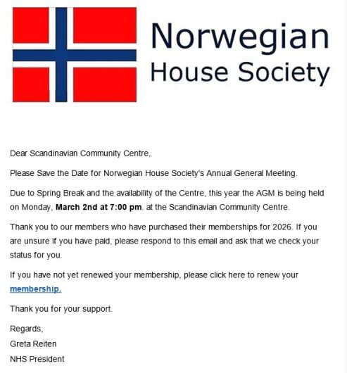 TAKE NOTICE: The Annual General Meeting of the Norwegian House Society will be held in-person at the Scandinavian Centre on Monday 2nd of March, 2026, at 7 pm to: